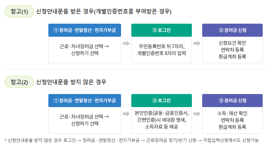 - 홈택스(PC): 국세청 홈택스 웹사이트 접속 → 신청/제출 → 근로장려금 → 정기 신청