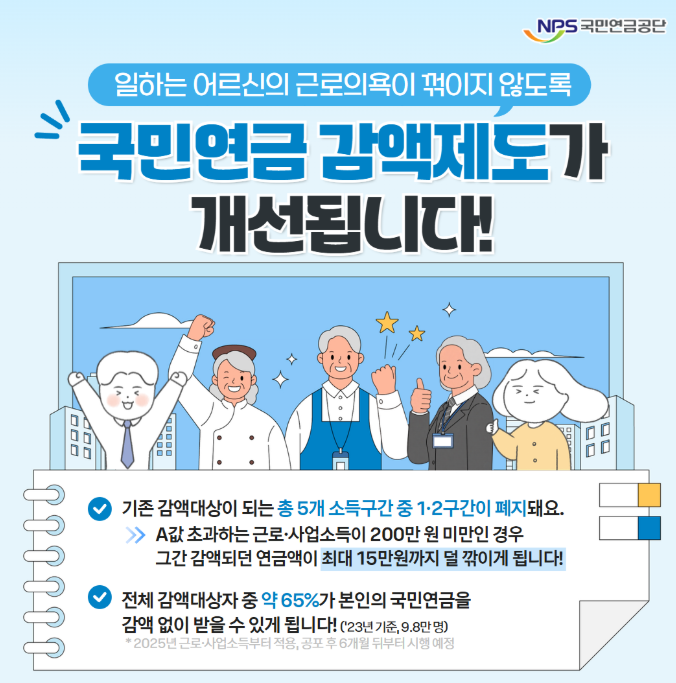 2026년부터 일하는 어르신의 국민연금이 대폭 완화됩니다. 근로·사업소득이 평균소득월액(A값)을 초과하더라도 200만 원 미만이면 감액이 전혀 없어져 약 9만 8000명이 혜택을 받습니다. 2025년 11월 27일 국회 본회의를 통과한 국민연금법 개정안으로, 기존 5단계 감액 중 1·2구간이 폐지되는 것이 핵심입니다. 초고령사회 진입과 함께 계속 일하고 싶은 어르신들의 근로 의욕을 살리기 위한 조치예요. 이 글에서 개정 내용과 실제 적용 사례, 주의사항까지 자세히 알려드립니다.