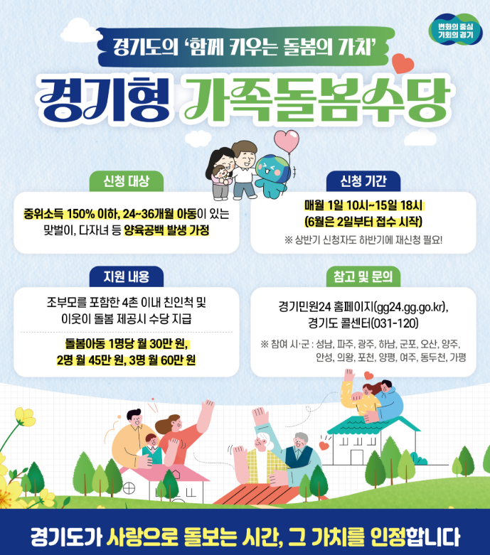 경기도는 **'경기형 가족돌봄수당'**이라는 명칭으로 지원하며, 서울시에 비해 지원 대상의 폭이 더 넓고 소득 기준이 유연하다는 특징이 있습니다.