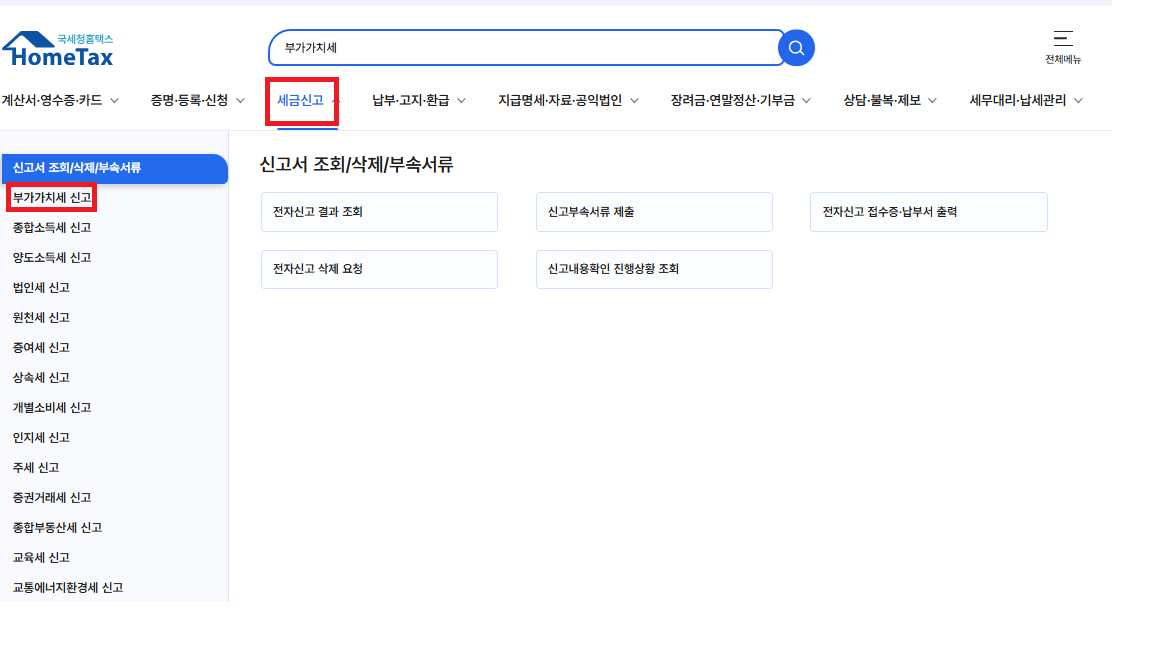 - 신고 메뉴 선택: '신고/납부' → '부가가치세' 메뉴로 이동합니다.