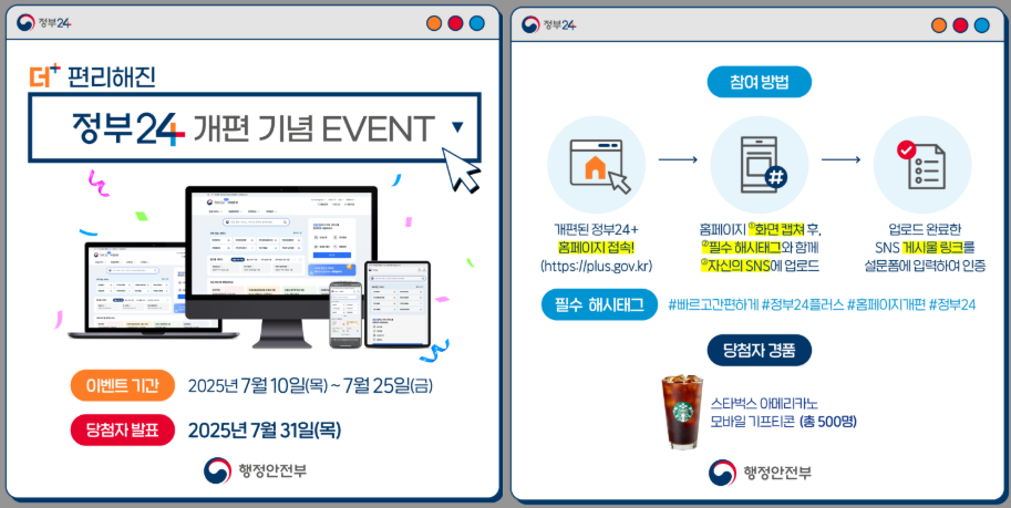 새로운 '정부24+'를 경험하고 푸짐한 선물도 받을 수 있는 이번 기회를 놓치지 마세요!