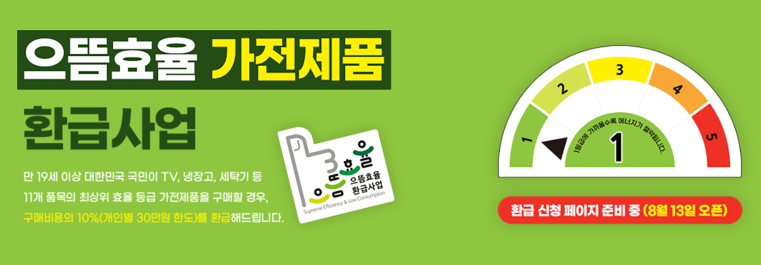 - 지원 방식: 으뜸효율 가전제품을 구매하면, 구매 금액의 10%를 환급해 줍니다.