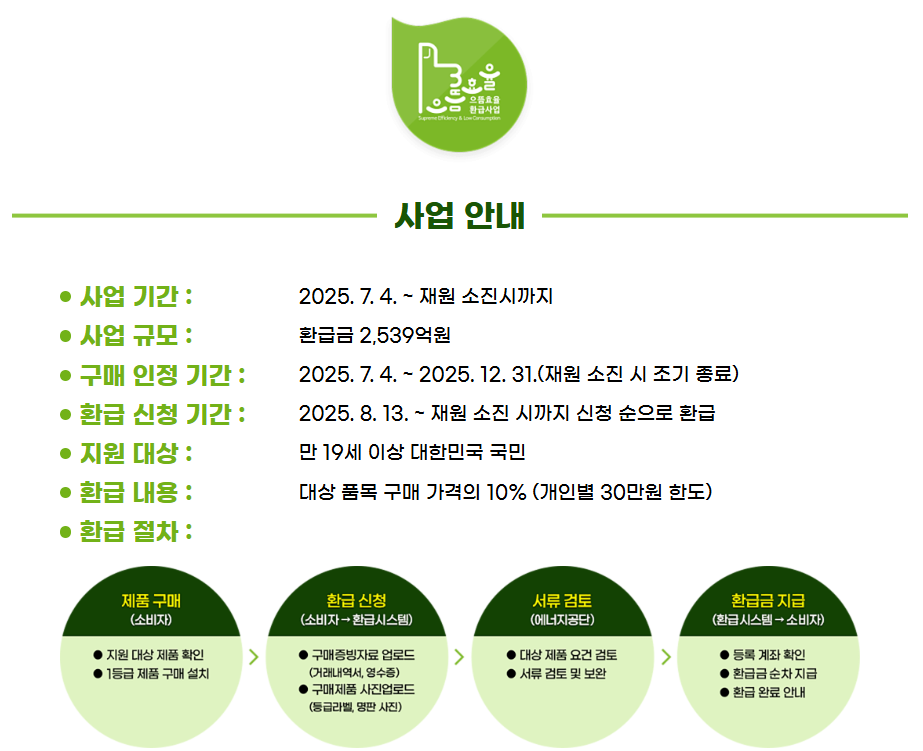 - 사업 목표: 에너지 효율이 높은 가전제품 구매를 유도하여 국민의 전기요금 부담을 줄이고, 친환경 소비를 확산하는 것입니다.